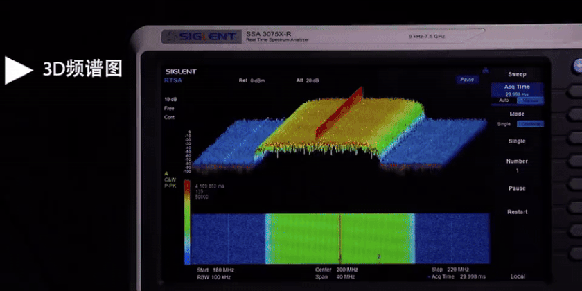 | SSA3075X-R:9 kHz~7.5 GHz | 实时频谱视图 | 概率密度谱,瀑布图,3D频谱,时间功率谱 | |