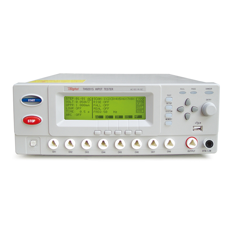 TH9201S八通道交直流耐压绝缘测试仪是一种为客户精巧设计的电气安规测试仪器。精简和紧凑的结构、成熟的技术。全新的结构和操作界面使操作和使用都更简便。包含更多实用的功能。TH9201S产品可广泛应用于变压器、设备、元器件特别是绕线元件的安全检查。