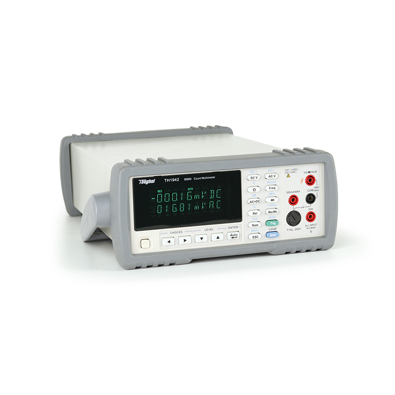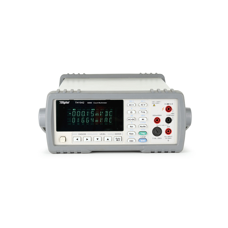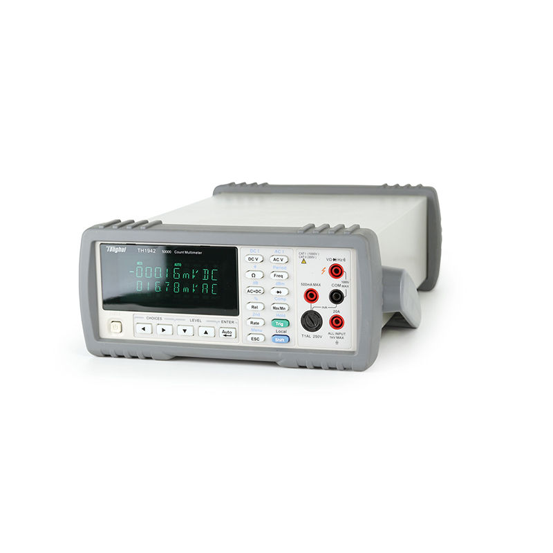 ■ TH1941型 4 1/2位真有效值数字多用表及TH1942型50,000读数数字多用表是一种多功能、高性价比的电压/电流/电阻测试仪器。仪器可以比同档产品高数倍的测量速度进行稳定测量。提供21,000/51,000字最大读数,0.03%/0.02%的最高直流电压准确度等一系列优良的性能和经济的价格为广大客户提供最优的选择。TH1941/TH1942提供高亮度VFD双显示器,可同时测量显示交流/直流电压或电流、交流电压/电流和频率等参数,不仅大大提高了测量效率,而且测试显示一目了然。机内采用SMD器件以减小整机密度,降低体积。 仪器配备标准的USB通讯接口,同时可提供通用的通讯软件以满足与计算机通讯、数据分析、统计、构建自动测试系统的需要。仪器接受SCPI(可编程仪器的标准命令)命令,以保证通讯软件的兼容性。