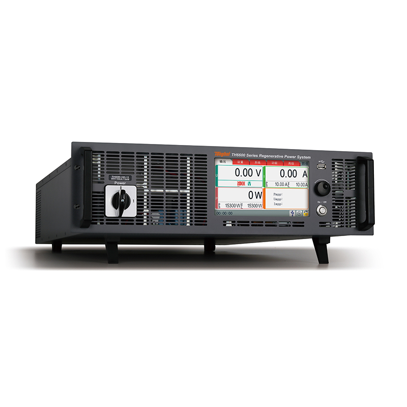 TH6600系列双向回馈式大功率直流电源输出和吸收电流时可快速无缝切换,有效避免电压或电流过冲,适用于电池、电池封装以及电池保护板等储能设备测试