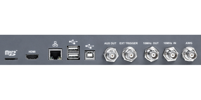 支持 2 个 USB Host 3.0 和 2 个 USB Host 2.0、1 个 USB Device 2.0 (USBTMC)、1 个 1000M LAN(VXI-11/Telnet/Socket)、1 个micro SD 卡、1 个辅助输出(Pass/Fail 和 Trigger Out 复用)、1 个 HDMI 视频输出接口、1 个 10 MHz In 和 1 个 10 MHz Out。