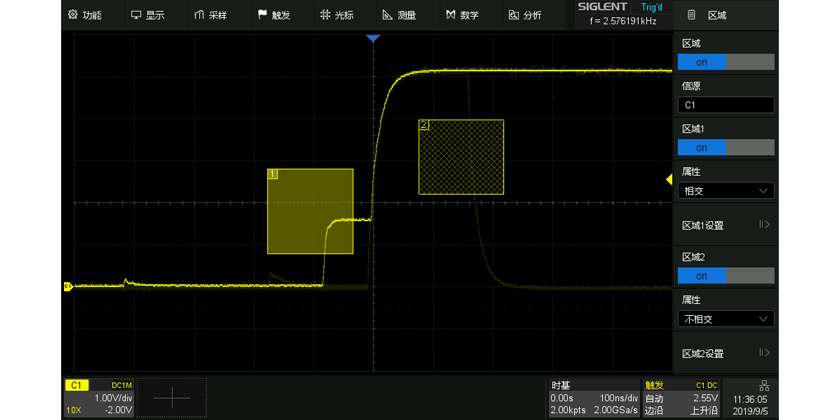 SDS3000X HD系列示波器提供丰富的触发类型,含边沿、间隔、超时、视频、串行总线、区域触发等,其中,区域触发不同于传统触发,它可应用于参数特征尚不明确的偶发信号,仅需使用鼠标或者触摸创建并定义区域即可完成信号的捕捉。总线触发支持 I2C、SPI、CAN、CAN FD、FlexRay、I2S、MIL-STD-1553B、SENT等多种总线,提供嵌入式、汽车、计算机等串行总线的测试解决方案。