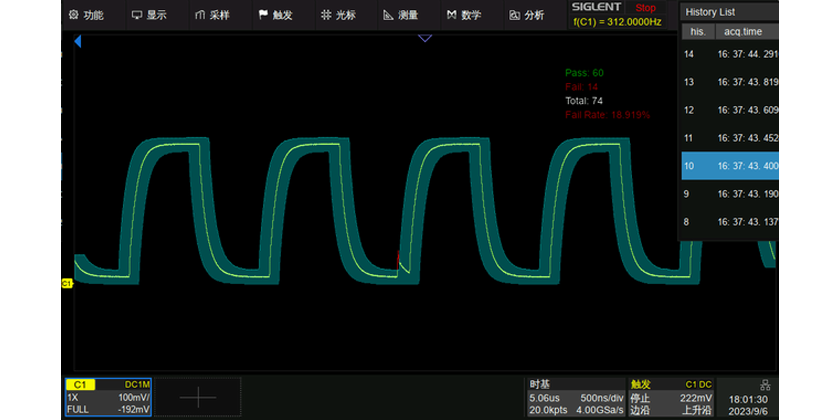 模板测试功能主要用于信号质量的评估,能够长时间监控波形的故障率,并根据故障波形定位原因。有两种规则设置方式,一是通过在示波器中绘制多边形模板创建规则,二是根据“完美波形”设置水平和垂直数值创建规则,而后示波器对波形进行实时测试,可统计在规定的测试条件内测试的次数、失败的次数、失败率等,还能够设置“存储失败帧”,失败波形可通过历史模式进行查看。