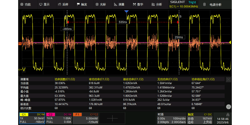 SDS3000X HD可选配电源分析功能,再搭配鼎阳的电压探头(如DPB5000系列)、电流探头(CP6000系列),可以快速、准确地分析电源质量、电流谐波、浪涌电流、瞬变响应、MSO管安全作业区(SOA)等12项参数,如通过将开关损耗降至最低提高电源效率、通过统计功率器件在所有工况下瞬时参数超出安全工作区的概率评估器件工作稳定性、通过对输入电流进行谐波分析,观察是否存在异常谐波影响电能质量等等,可以提高电源开发人员的工作效率。