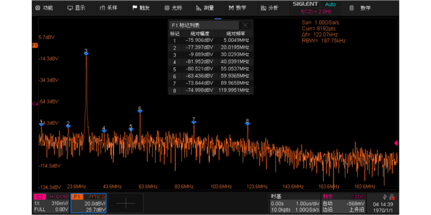 通过硬件加速的FFT 功能,最大运算点数为2M点,在提供优越的频谱分辨率的同时,仍然能够保持较高的频谱刷新率。支持多种窗函数,支持普通、平均、最大值保持等模式,支持自动标记峰值点并形成列表。