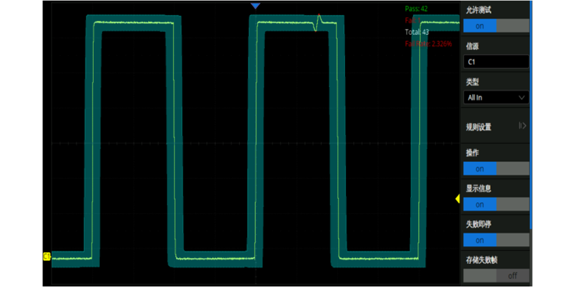 基于硬件的模板测试功能,最高每秒可执行70 000次测试。根据用户自定义的垂直和水平容限生成模板,通过比较被测信号是否触碰模板判断测试是否失败,不仅可以预先设定测试失败时采集停止以及蜂鸣器告警,还可以将失败帧自动截图或存入历史帧,非常适用于长期无人值守时监测异常信号。