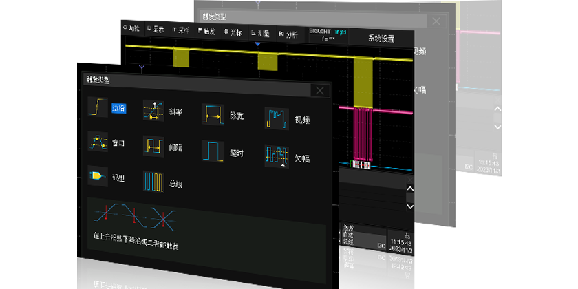 | 2(SDS812X EDU、SDS822X EDU) | 触发类型 | 边沿(Edge)、斜率(Slope)、脉宽(Pulse width)、窗口(Window)、欠幅(Runt)、间隔(Interval)、超时(Dropout)、码型(Pattern)、视频(Video)、前提边沿(Qualified)、第N边沿(Nth edge)、延迟(Delay)、建立/保持时间(Setup/Holdtime)、串行触发 | |||