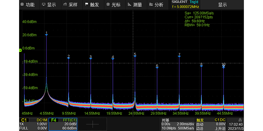 内置 FFT 功能,最大运算点数为 2M 点,4 条独立 Math 波形,支持用户自定义运算表达式。在优越的频谱分辨率下可更准确的分析信号频率成分及能量分布,轻松化身一台频谱分析仪。FFT模式下支持多种窗函数,支持普通、平均、最大值保持等模式,支持峰值检测,自动检测杂散频率并标记形成列表显示。