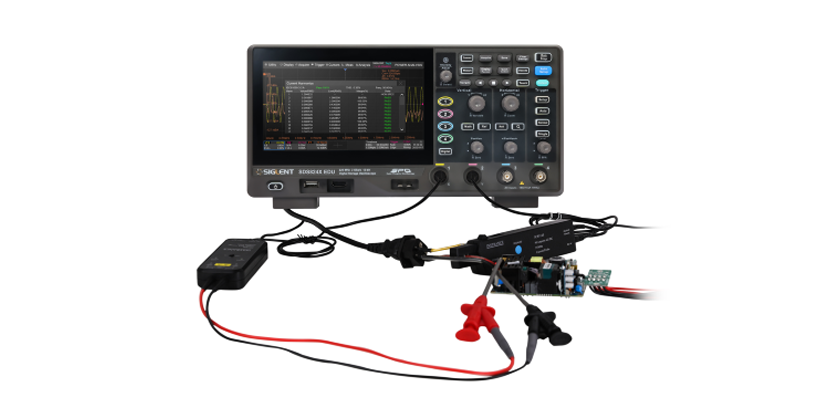 SDS800X EDU的电源分析功能搭配鼎阳科技的电压探头(DPB5000系列)、电流探头(CP6000系列),可以快速准确地分析电源质量、电流谐波、浪涌电流、瞬变响应、安全作业区(SOA)等12项参数,帮助工程师解除繁琐的手工配置和复杂的公式计算,极为适用于观察异常谐波、进行谐波分析、评估器件稳定性、判断电磁干扰等测试。