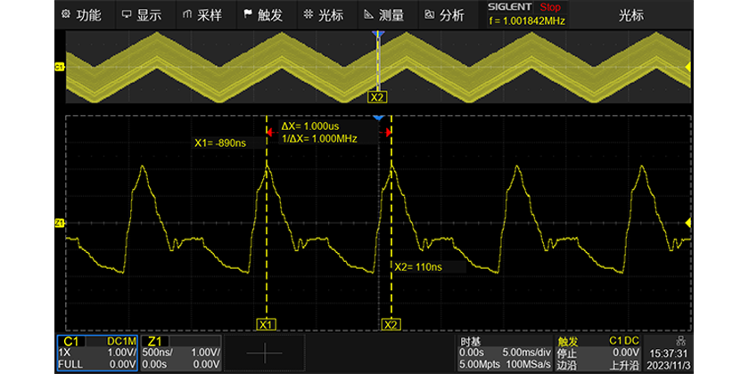 SDS800X HD最大存储深度可达100 Mpts,适用于观察分析长时间信号、低频信号和瞬态现象。大存储深度下,示波器能够处理的数据量多,计算结果的准确性和稳定性也越高。