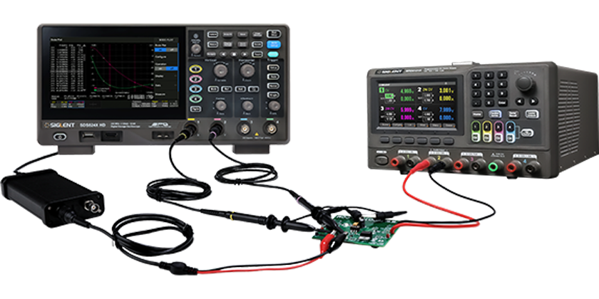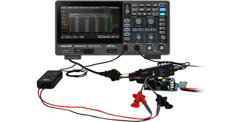 SDS800X HD的电源分析功能搭配鼎阳科技的电压探头(DPB5000系列)、电流探头(CP6000系列),可以快速准确地分析电源质量、电流谐波、浪涌电流、瞬变响应、安全作业区(SOA)等12项参数,帮助工程师解除繁琐的手工配置和复杂的公式计算,极为适用于观察异常谐波、进行谐波分析、评估器件稳定性、判断电磁干扰等测试。