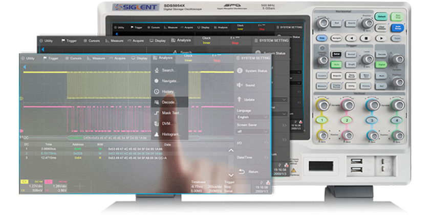 SDS5000X配备10.1英寸触屏,可快速调整波形位置,设定区域触发,进行参数选择和设置。SDS5000X支持多达几十种参数测量,如果用传统的旋钮进行选择,无疑会耗费大量时间,触屏选择,省时省力。此外,SDS5000X还支持外接鼠标和键盘。