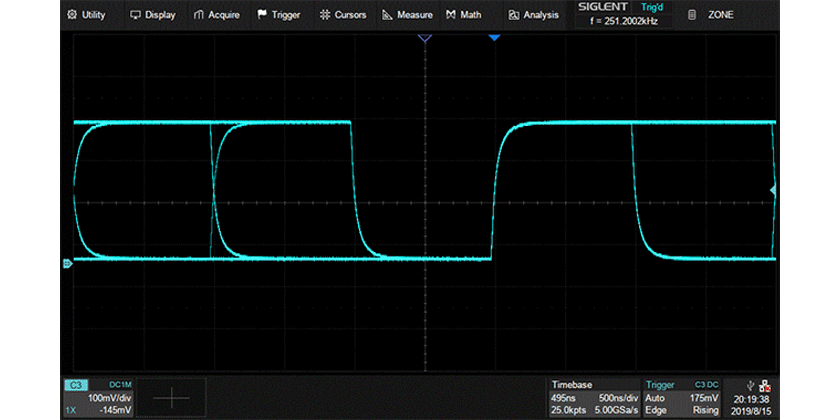 SDS5000X支持多达11种智能触发类型,能快速触发不同特征的信号。比如使用欠幅触发(Runt)可快速在设定幅度值处触发。