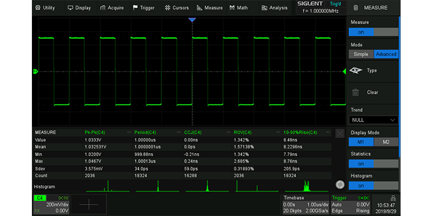 参数统计功能可显示任意参数的五种测量值:当前值、平均值、最小值、最大值、标准差;可同时测量统计12种不同的参数。直方图统计可以直观地显示参数的概率分布情况;趋势图可反应参数随时间的变化规律。