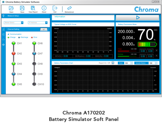 | Chroma 提供多信道电池仿真器与双向直流电源控制仪控面板,使用者可方便的进行电池仿真器功能使用。