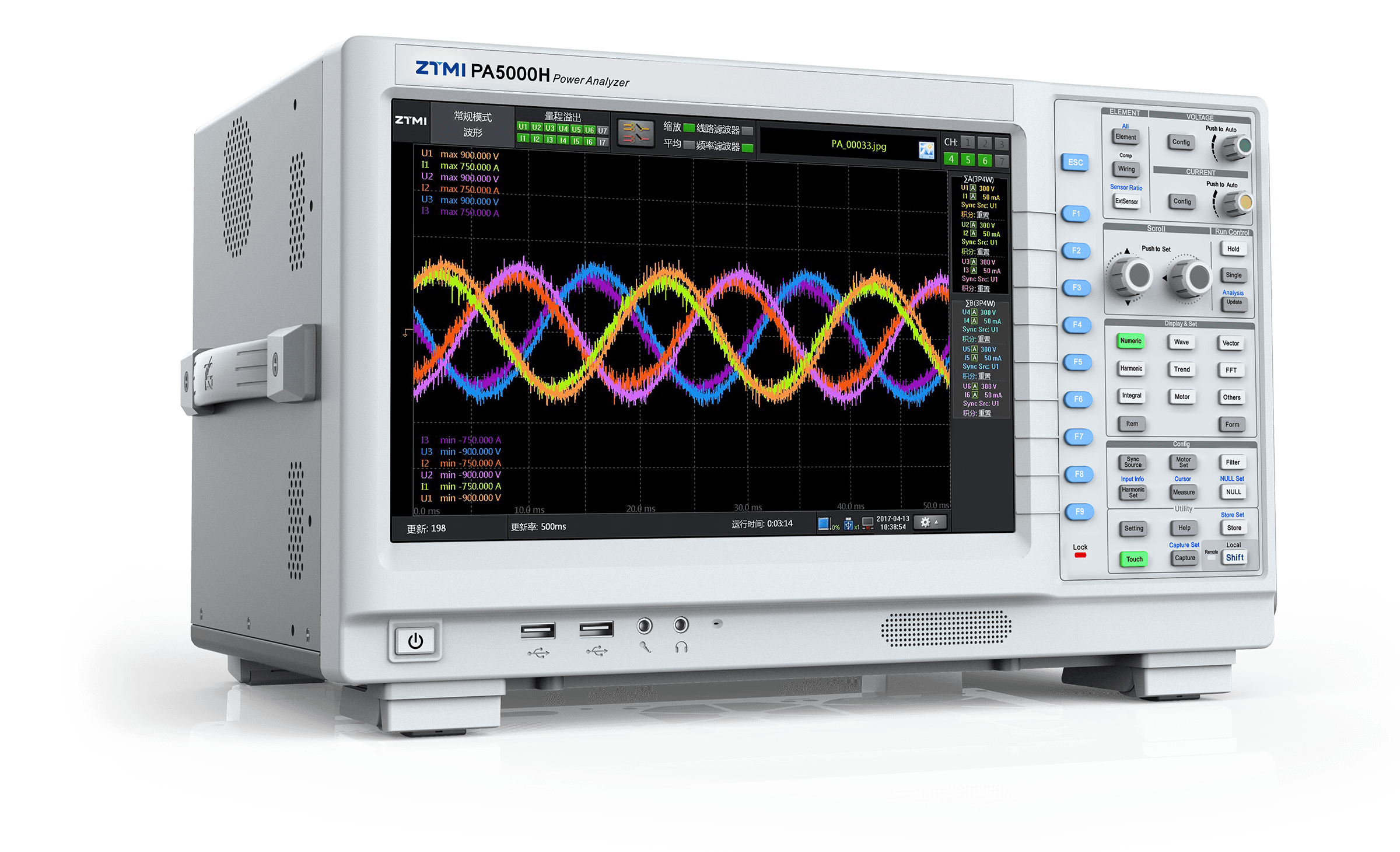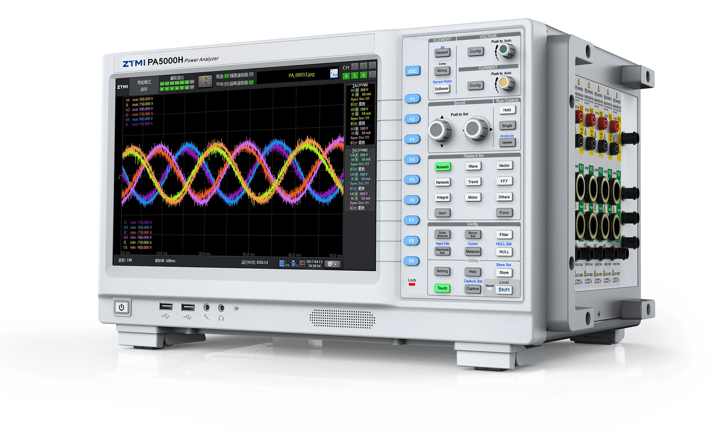 PA5000H功率分析仪采用了高稳定度温度补偿的100MHz同步时钟,避免了温漂带来的测量误差,使每个通道的相位误差都在10ns以内,保证了有功功率及功率因数测量精度。