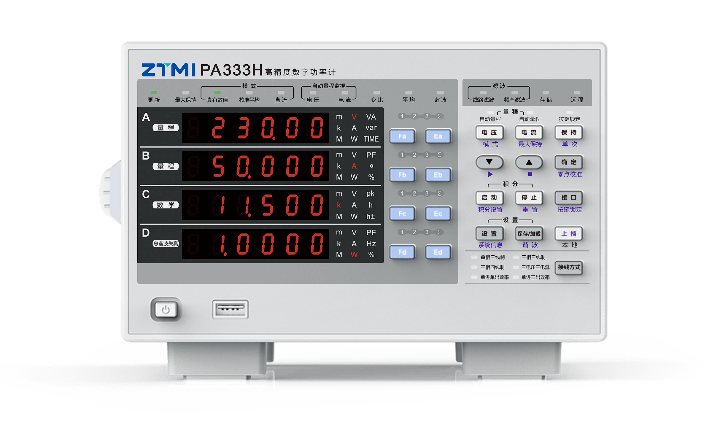 PA333H功率计采用了双分流器技术,它无需使用外部传感器便可以直接测量高达1500V的电压、75A的电流,可轻松满足高达50KW的大功率测试要求。